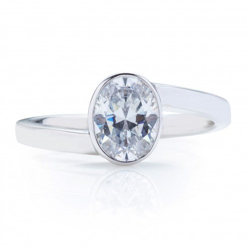 This engagement ring features an oval diamond center stone. The center stone is bezel set and is held with an asymmetrical tension-style shank and high polish finish. Image features a 1ct center stone.