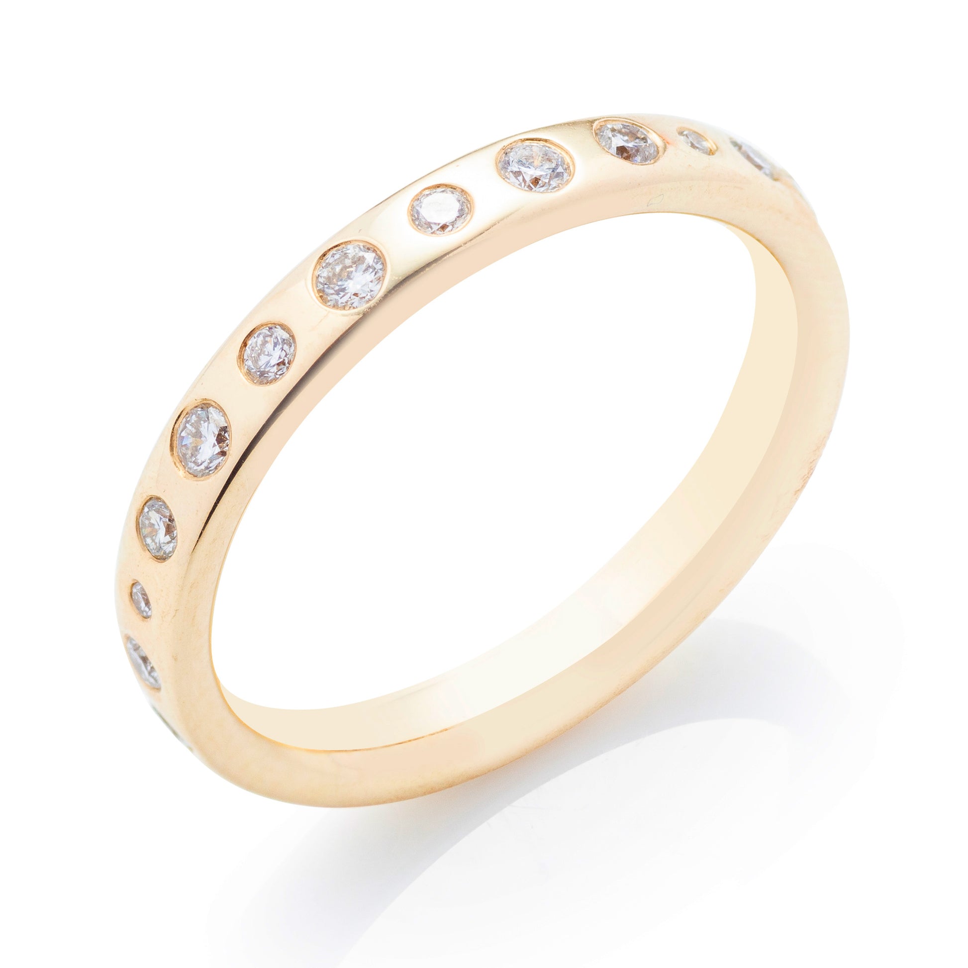 This eternity band features round diamonds alternating burnished set all the way around the ring.