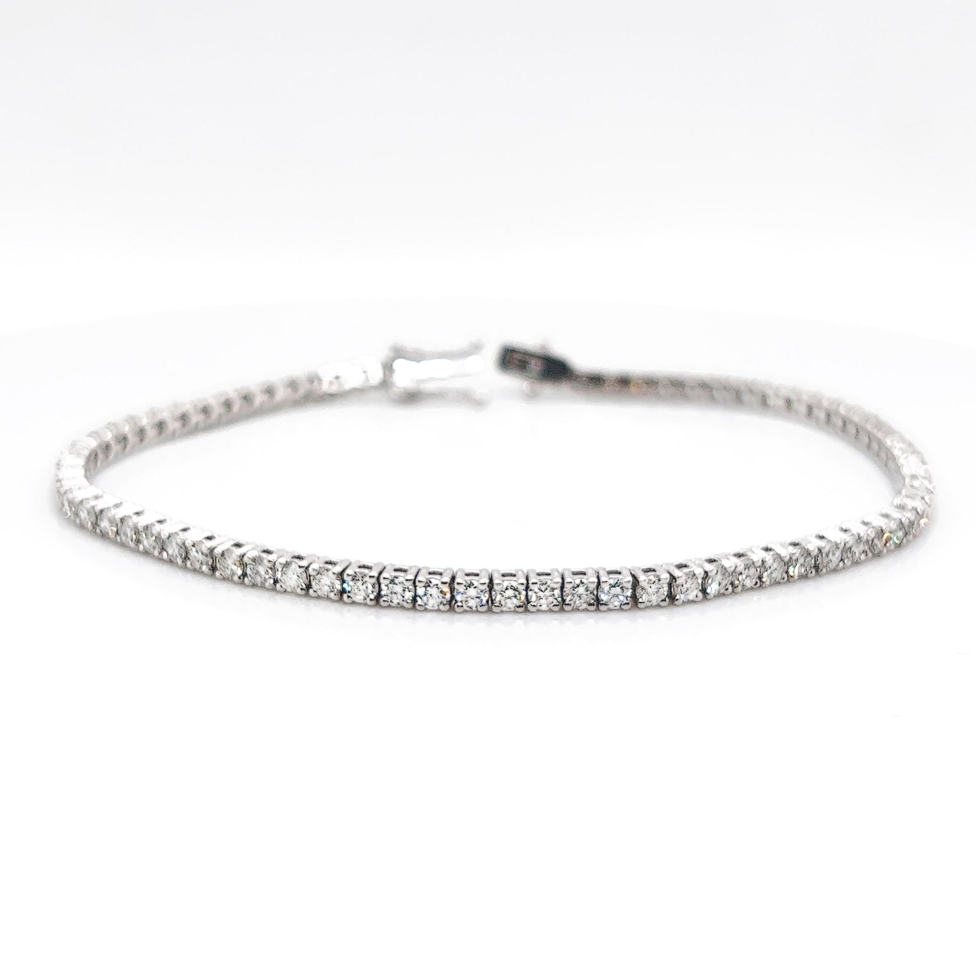 Discover timeless elegance with our 14K white gold tennis bracelet, featuring sparkling 4-point diamonds in secure four-prong settings. This classic piece combines durability with luxury, perfect for enhancing any outfit. 7 inches, 2.8ctw
