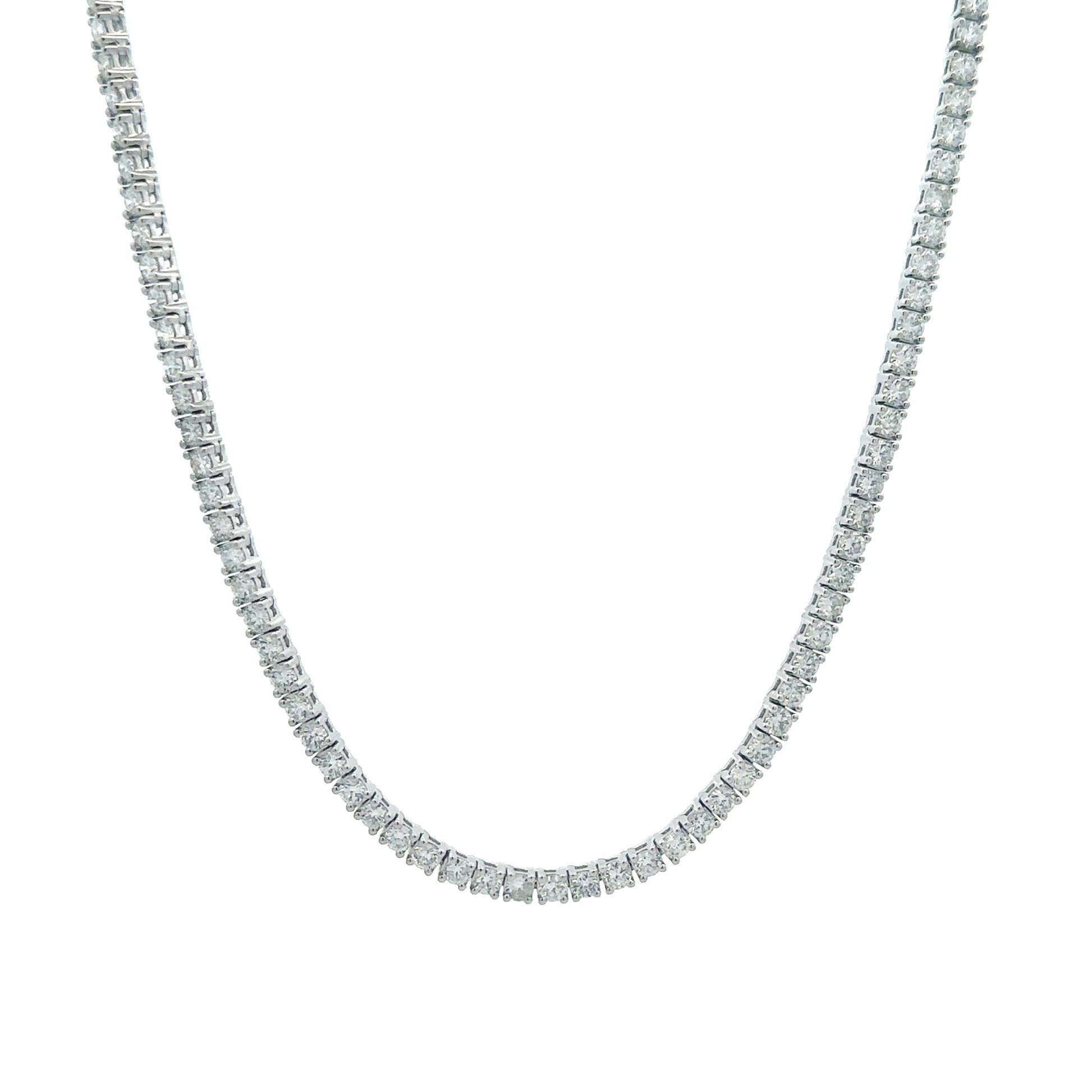 Discover timeless elegance with our 14K white gold tennis necklace, featuring sparkling 6.5 point diamonds in secure four-prong settings. This classic piece combines durability with luxury, perfect for enhancing any outfit. 9.45ctw