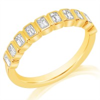 This ring features emerald cut diamonds which are bezel set north south and go halfway around the band.