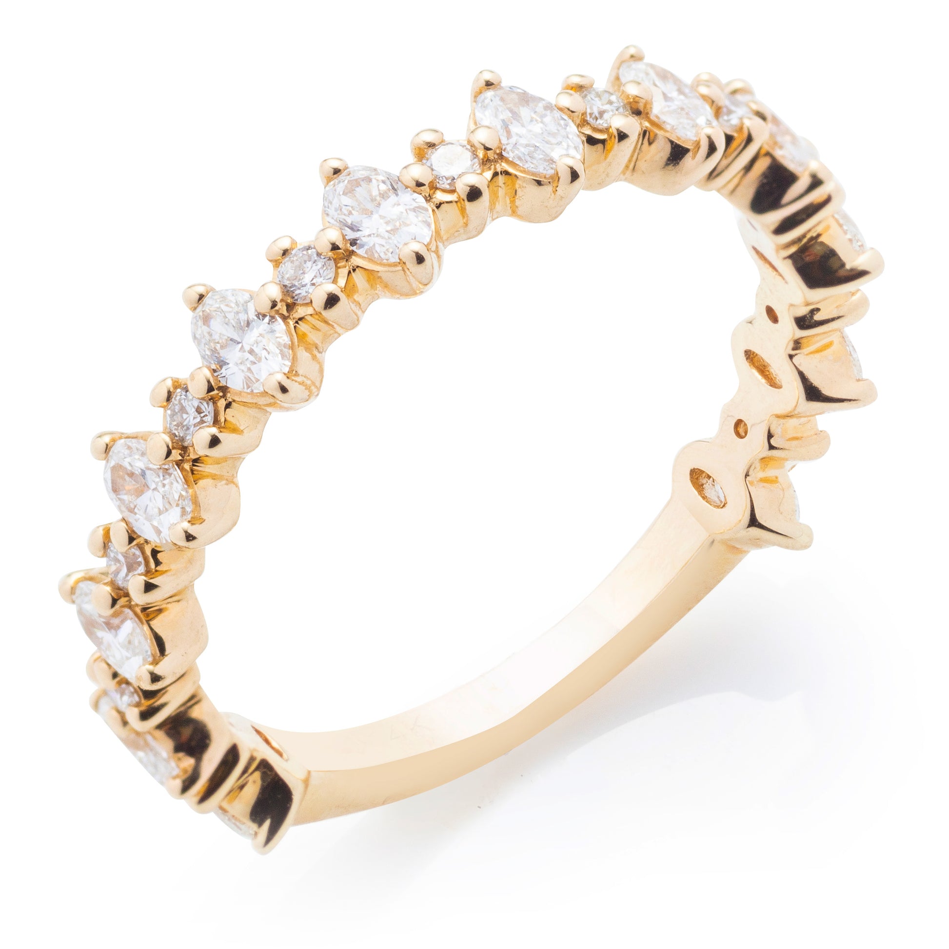 This ring features north-south set oval diamonds which are kite set and alternating with round diamonds three quarters of the way around the ring.