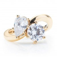This engagement ring features a round diamond and pear diamond in a curved band.